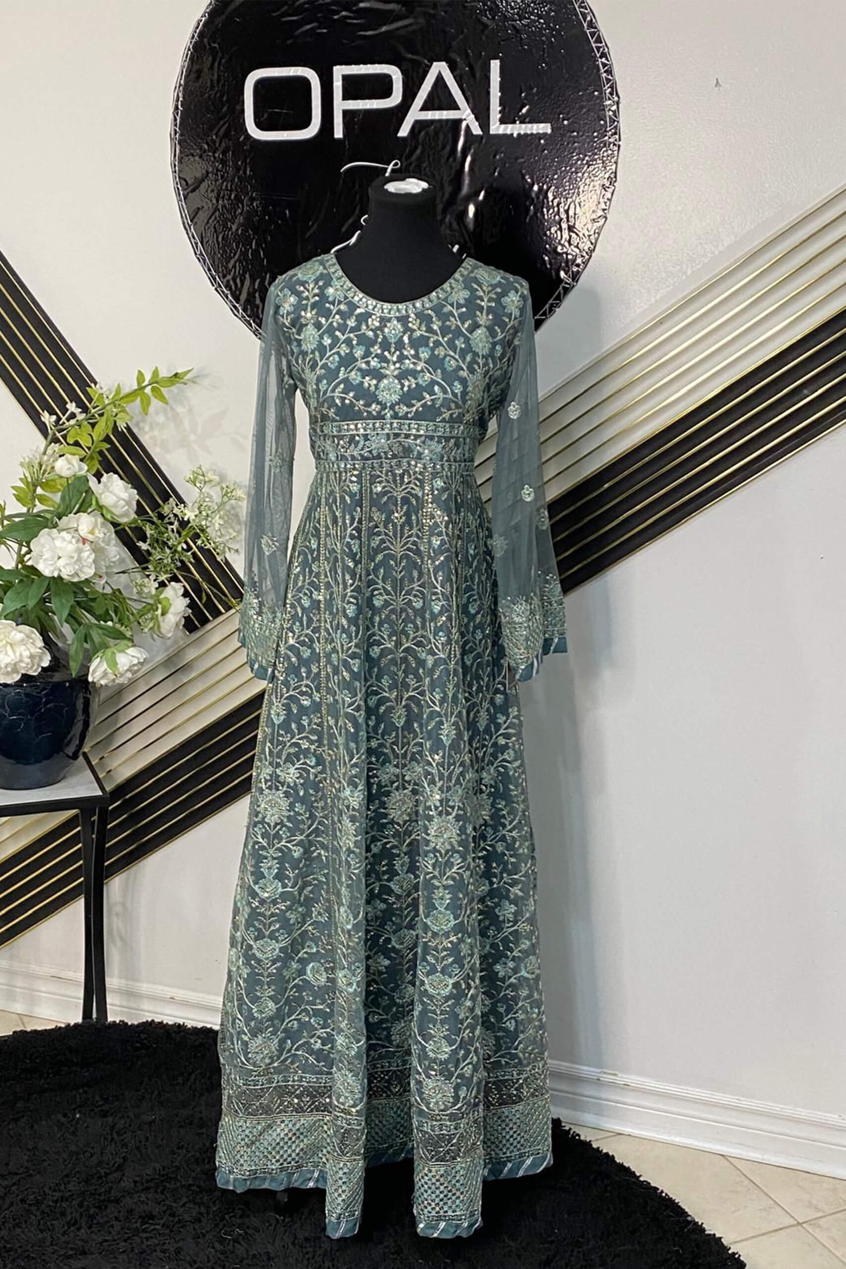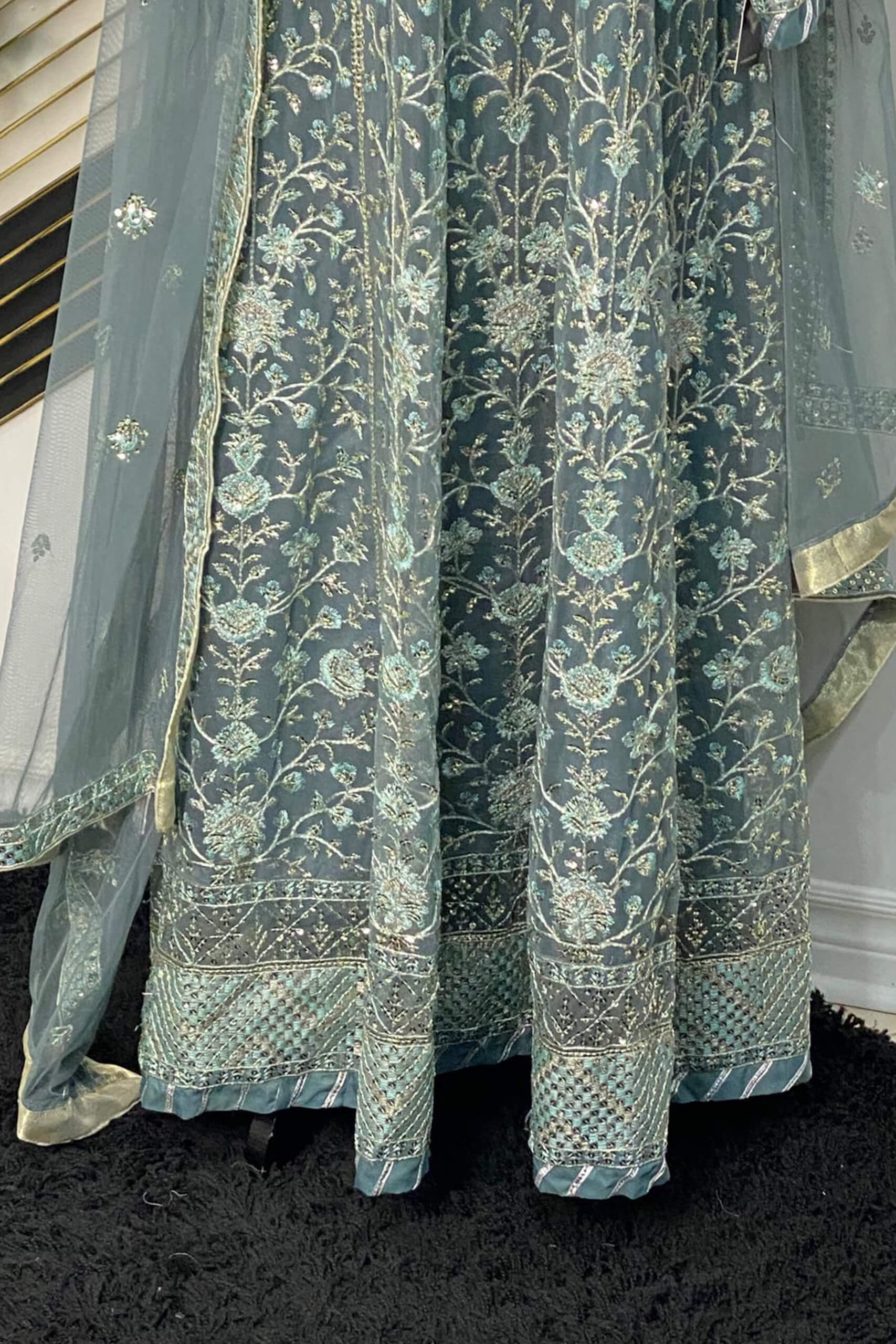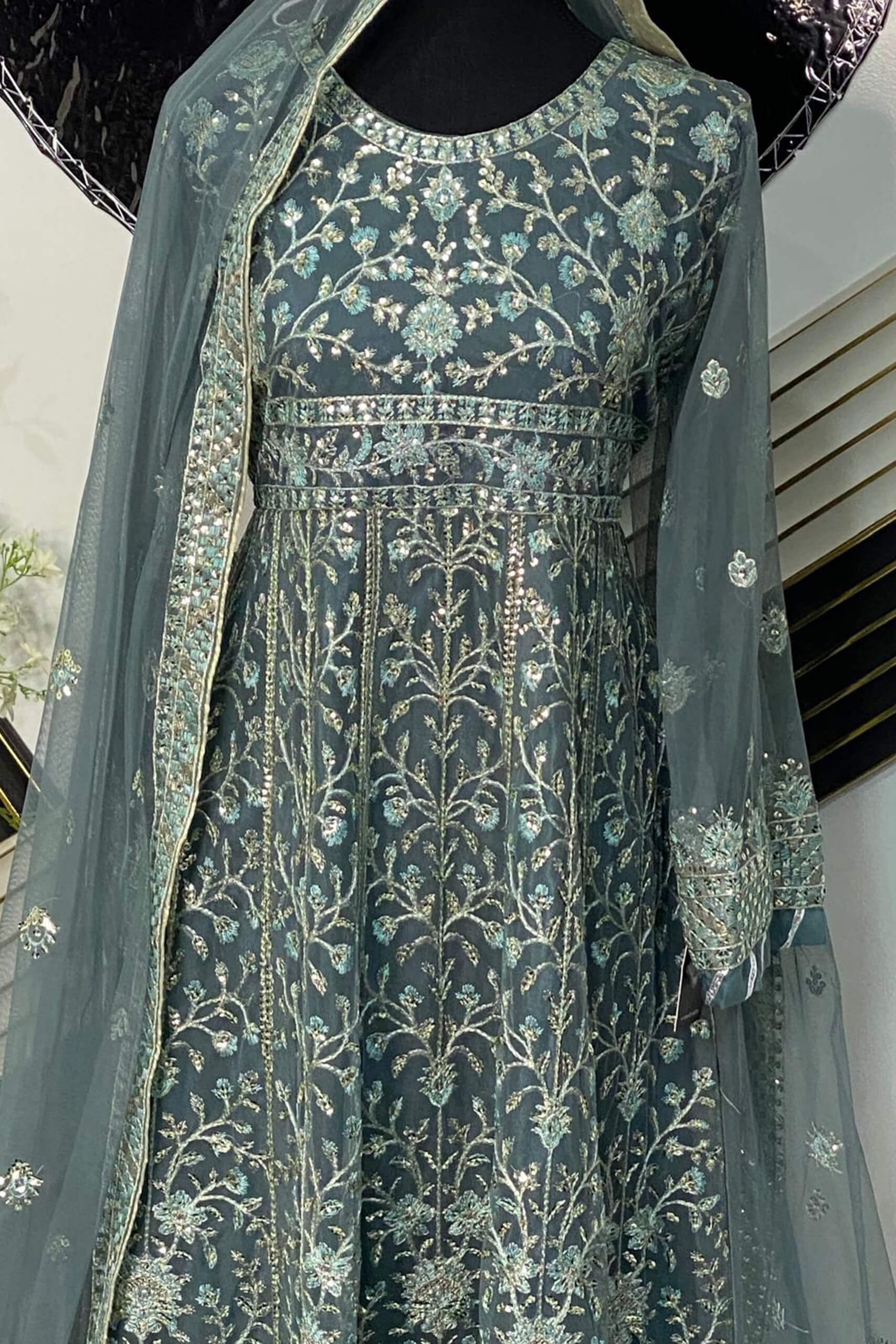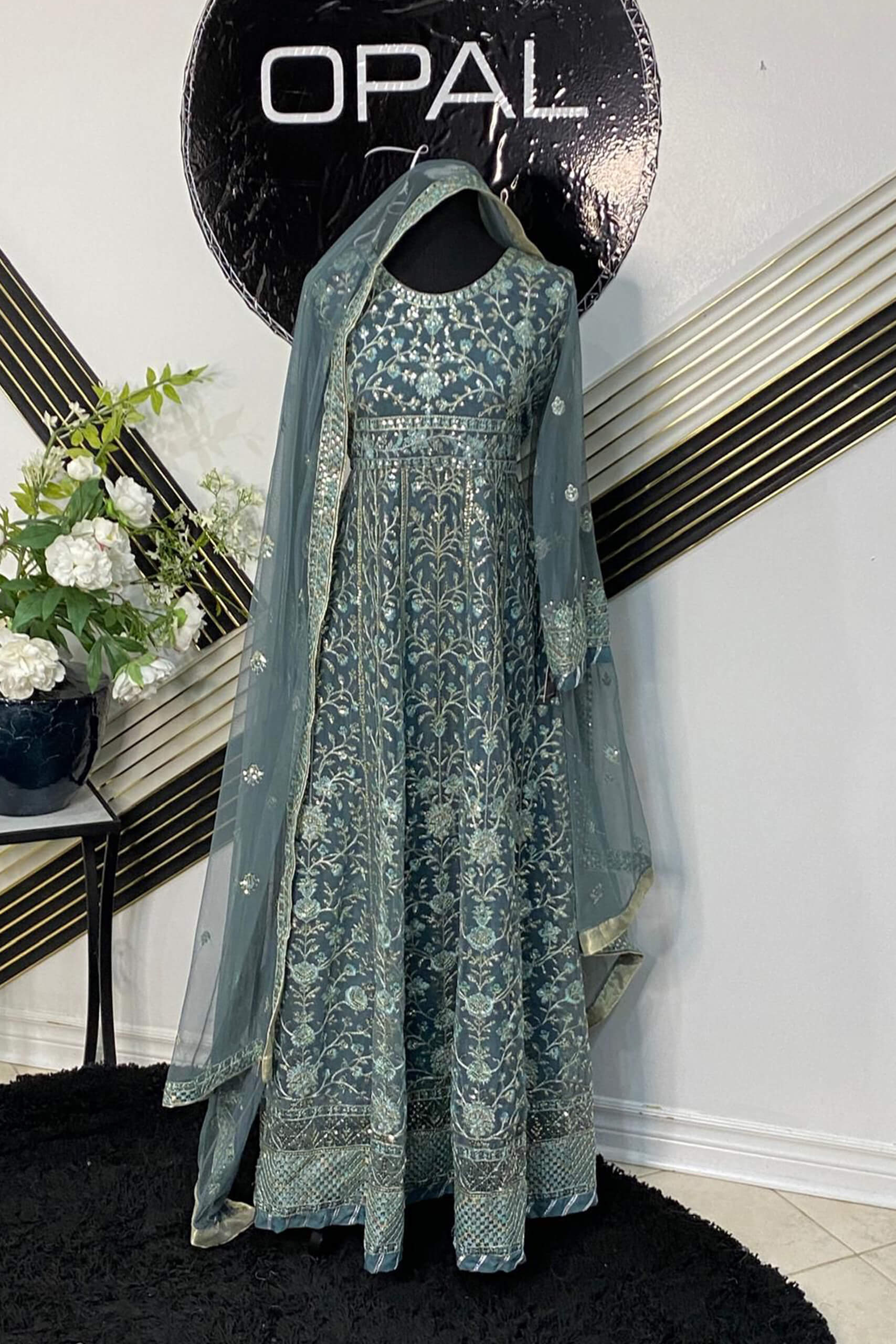 Step into timeless grace with this exquisite Asim Jofa creation. This teal chiffon long dress is adorned with intricate silver and gold threadwork embroidery that flows seamlessly throughout the outfit. The detailed floral and vine patterns enhance its regal charm, while the matching net dupatta with delicate embellishments completes the ethereal look. Perfect for weddings, formal events, or festive occasions — this ensemble embodies the sophistication Asim Jofa is renowned for.