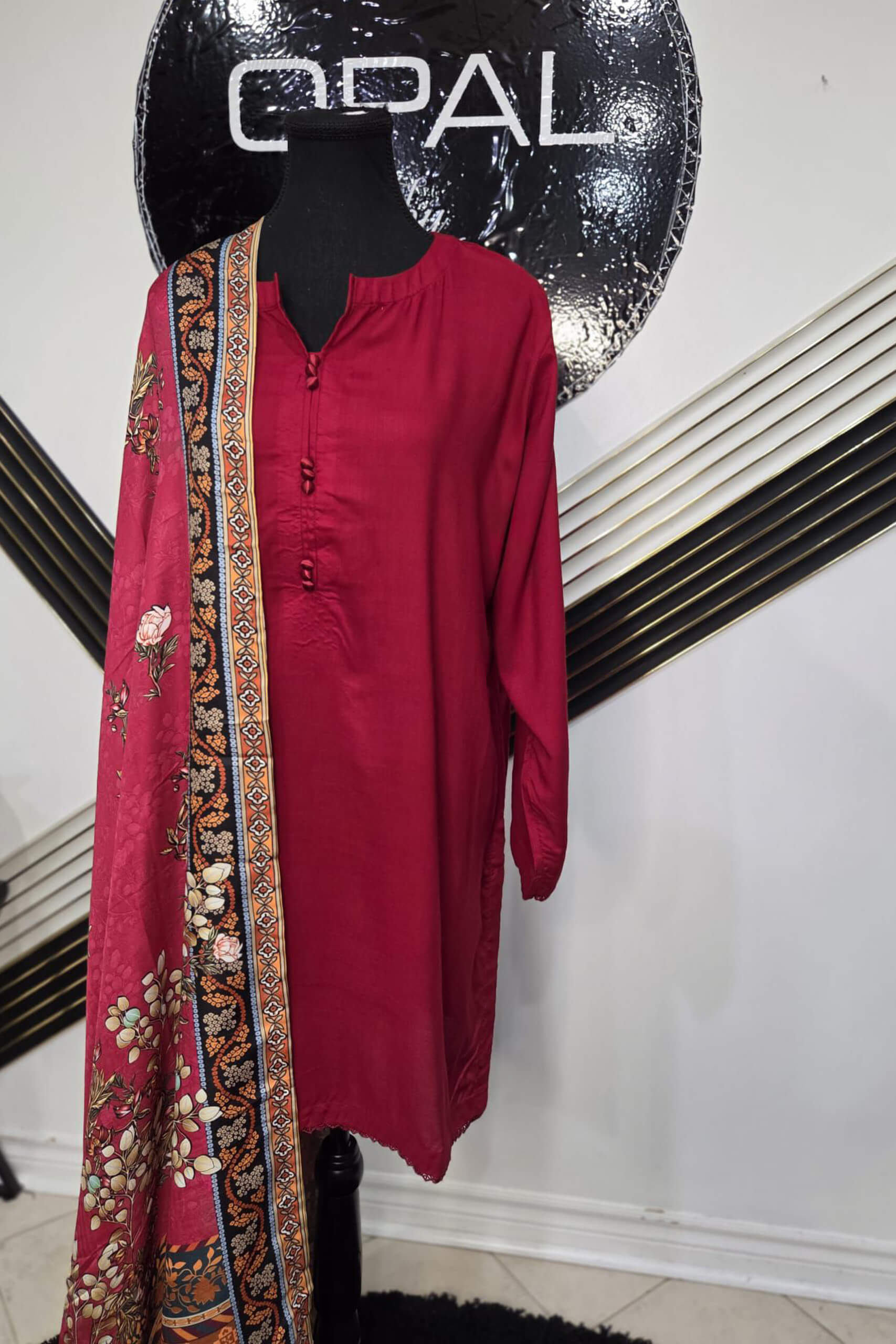 Designed for comfort and style, this dress comes with a plain shirt and trouser, paired with a floral printed dupatta for a chic look.