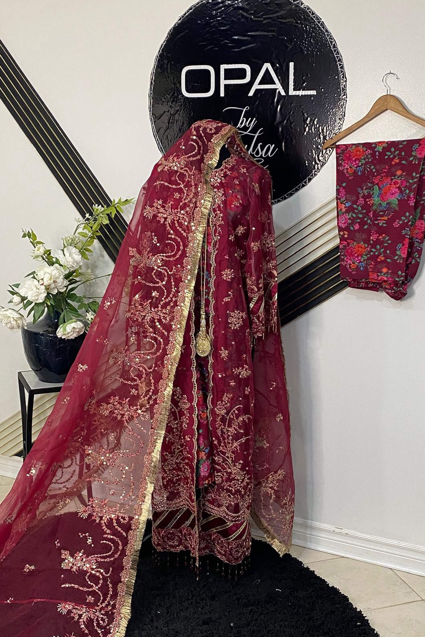 Step into timeless elegance with this beautifully crafted three-piece ensemble. The outfit features a richly embroidered net dupatta adorned with intricate detailing and a touch of shimmer, perfectly complementing the embroidered shirt with graceful patterns. Paired with a printed trouser, this outfit blends tradition with modern flair, making it ideal for festive occasions, weddings, and formal gatherings. The fine craftsmanship and delicate embellishments ensure you stand out with sophistication and charm.