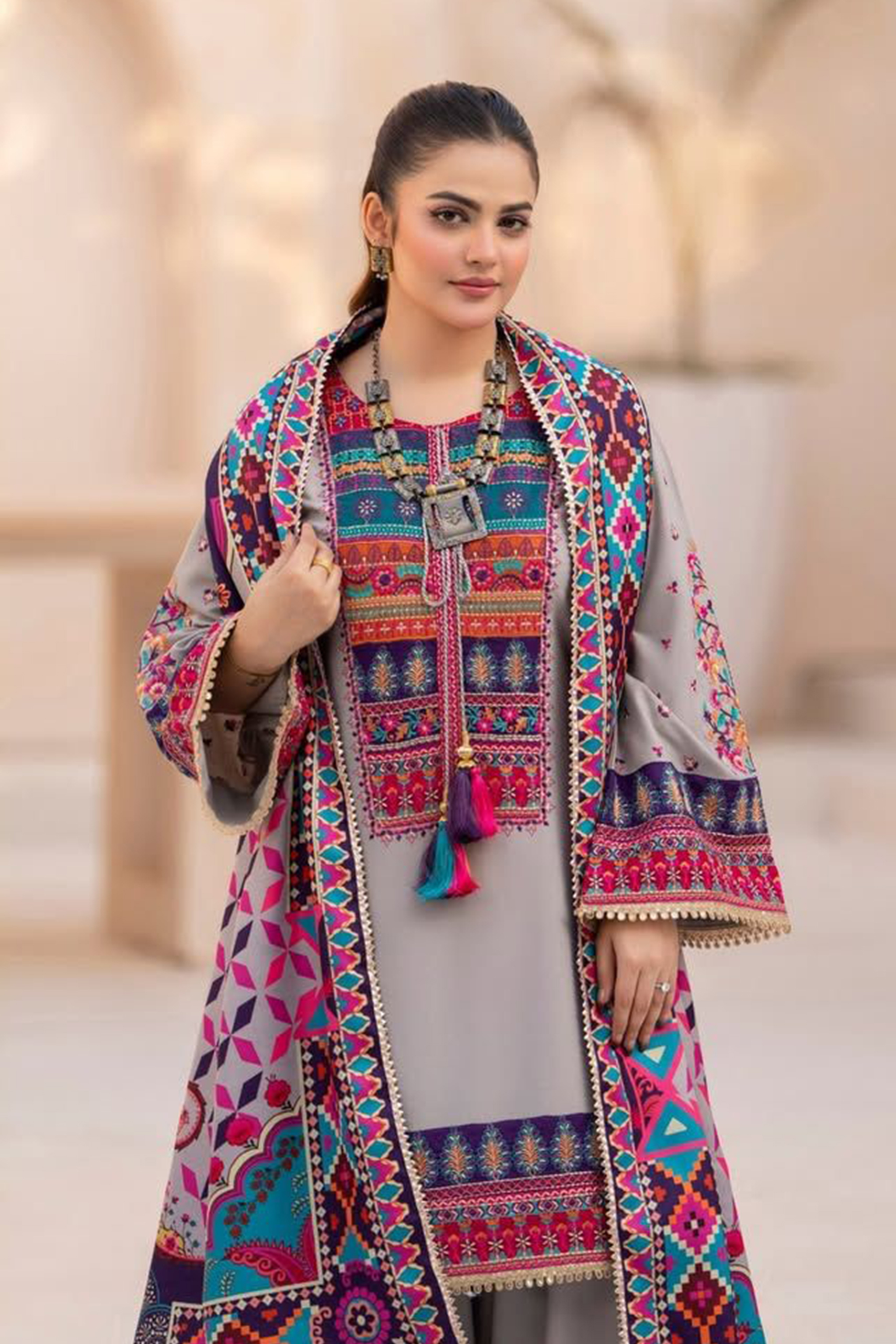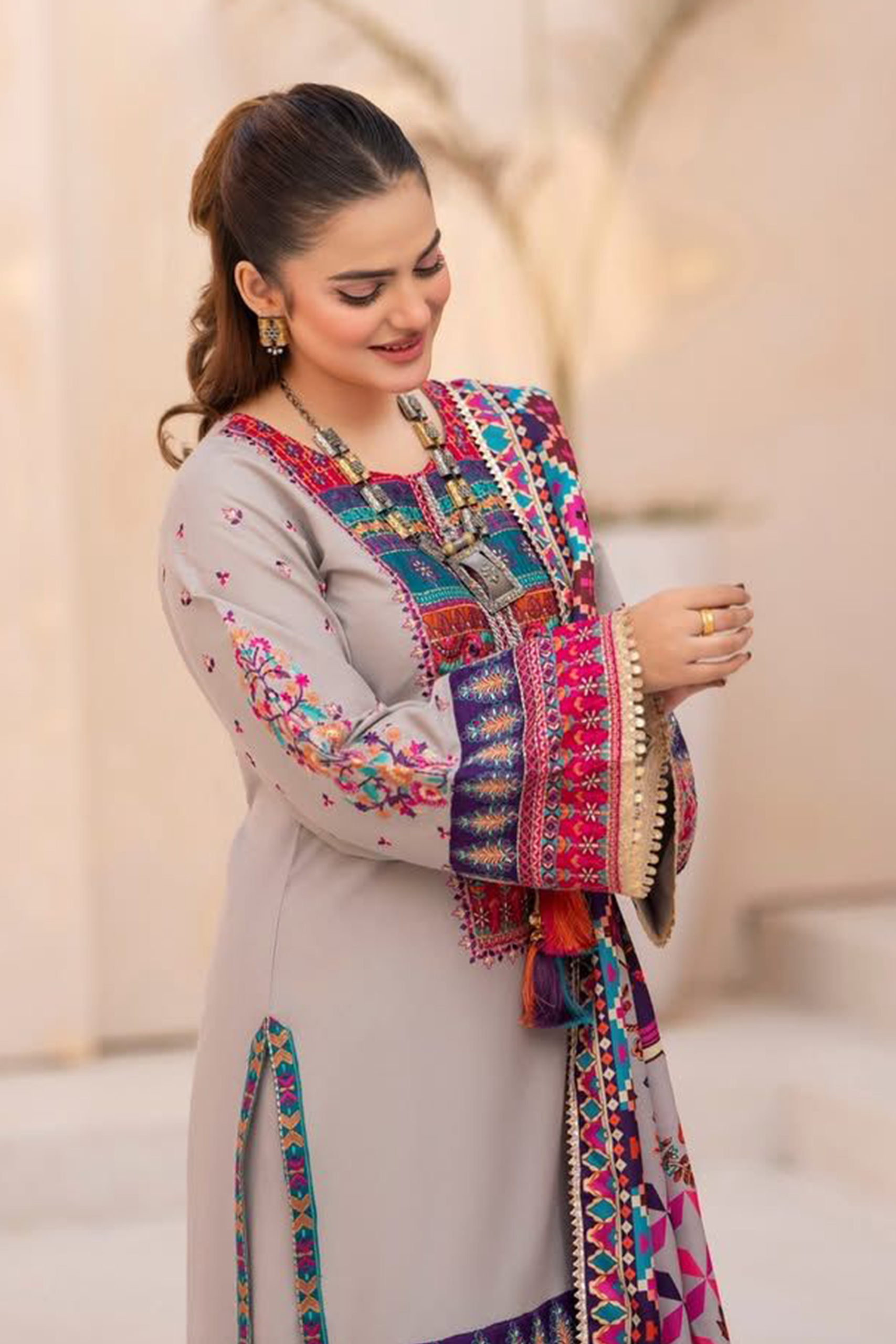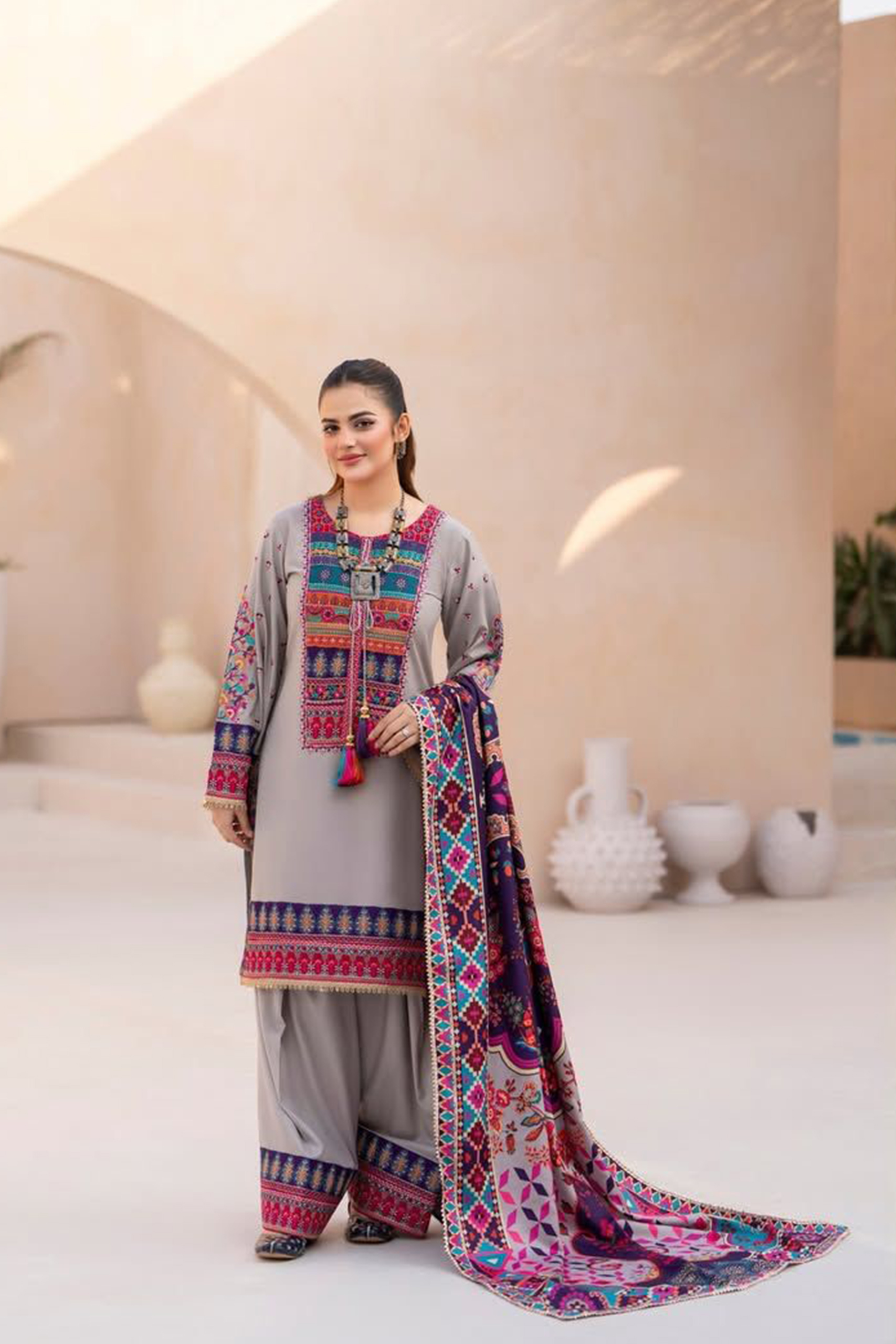 Discover the perfect look. Its soft Dhanak feel, elegant thread embroidery, and refined detailing make it an ideal winter outfit for casual gatherings, dawat wear, and everyday comfort. Designed for ease and style, it brings a polished charm to your wardrobe.