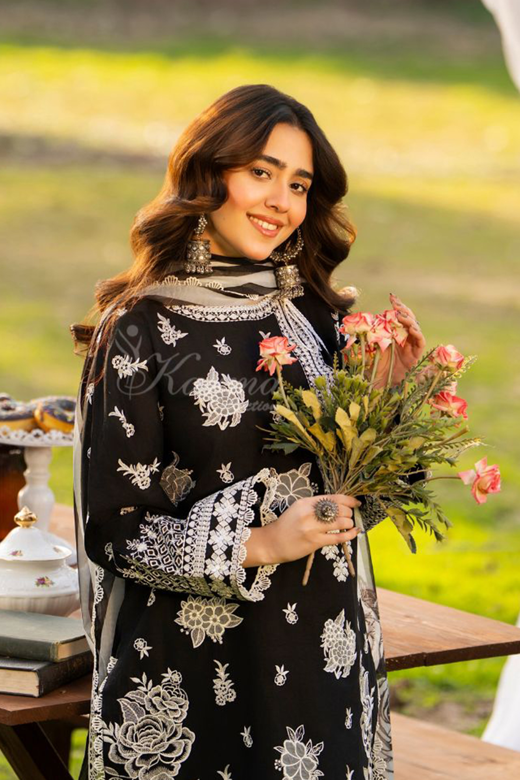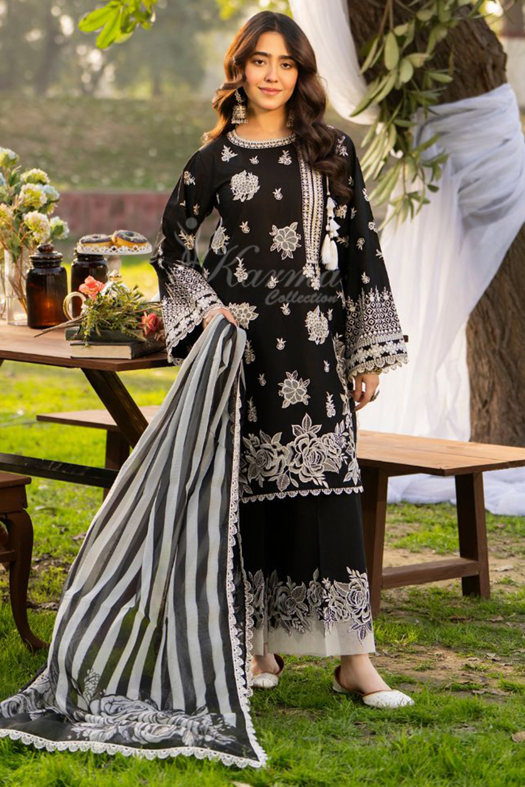 From the Karma Silk Collection, this beautifully crafted ensemble stands out with its intricate floral embroidery and artistic detailing. The balanced placement of patterns creates a refined look that blends elegance with contemporary design. Finished with a striking printed dupatta, this outfit delivers effortless sophistication for stylish occasions.