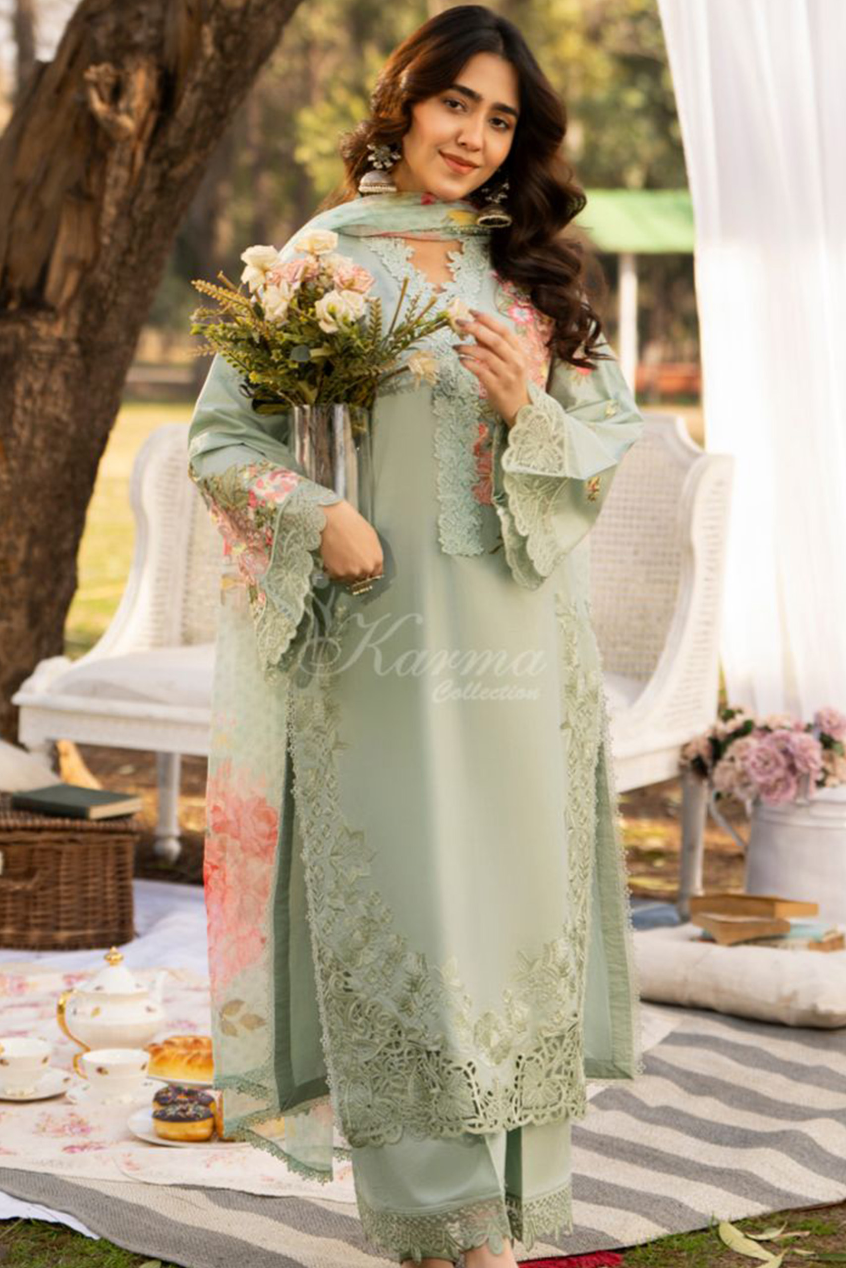 From the Karma Silk Collection, this beautifully designed ensemble showcases delicate embroidery and artistic lacework that highlight refined craftsmanship. The graceful flow and intricate accents create a sophisticated look that feels both elegant and contemporary. Perfect for memorable gatherings, it reflects timeless beauty and effortless sophistication.