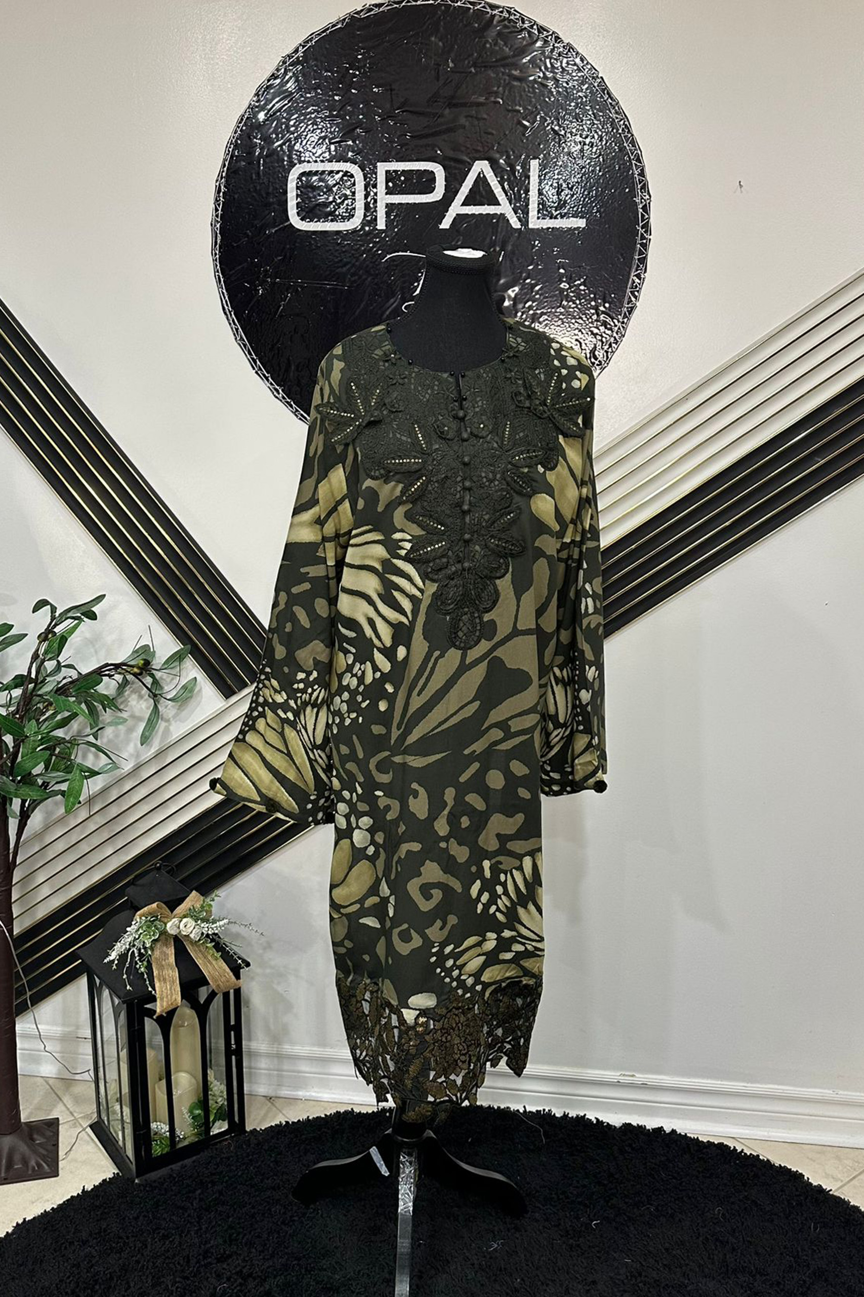 This stylish outfit features a bold artistic print complemented by intricate embroidery along the neckline for a refined statement. The relaxed silhouette and elegantly flared sleeves add a graceful and contemporary touch. Finished with delicate lace detailing at the hem, this design is perfect for chic gatherings and festive occasions.