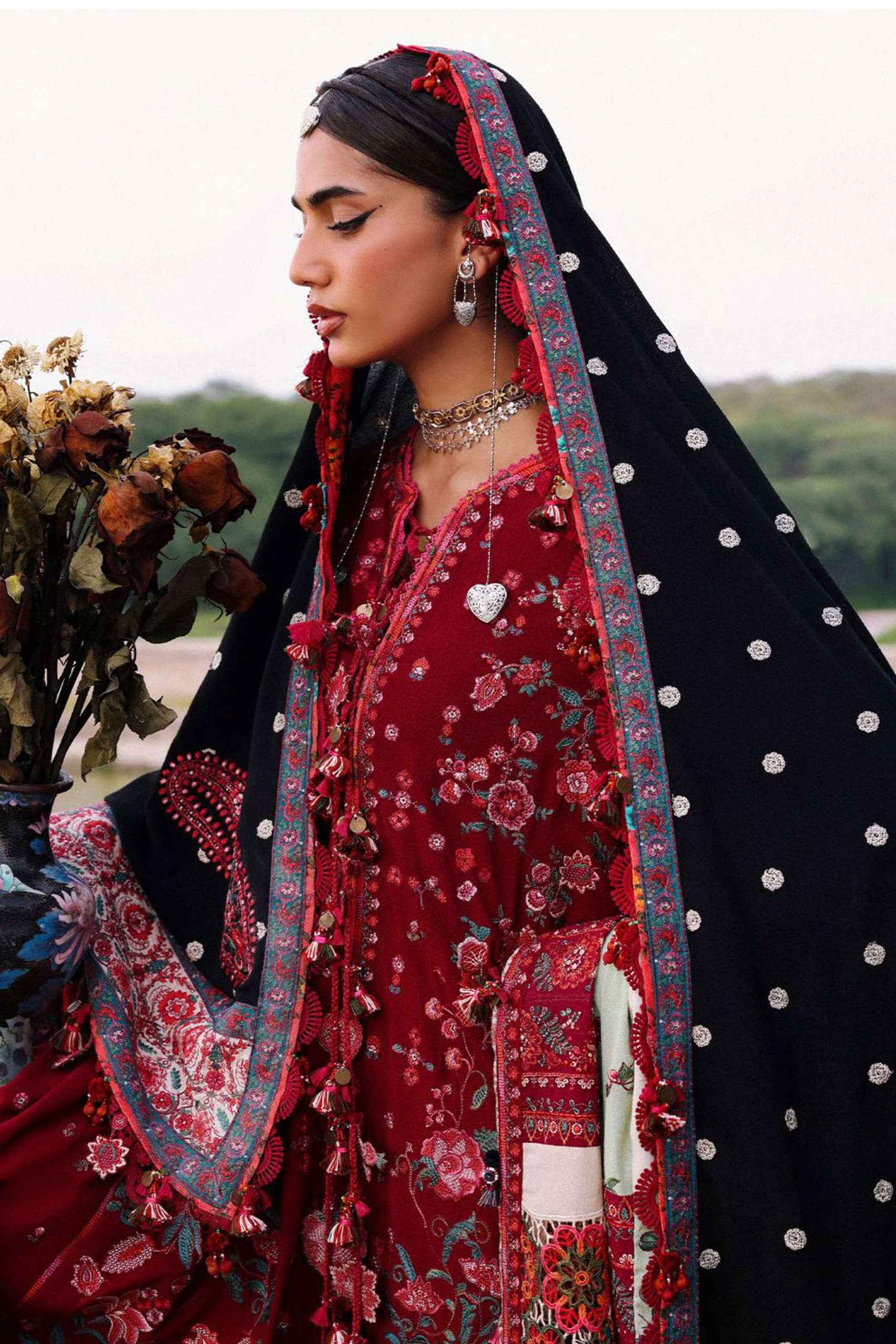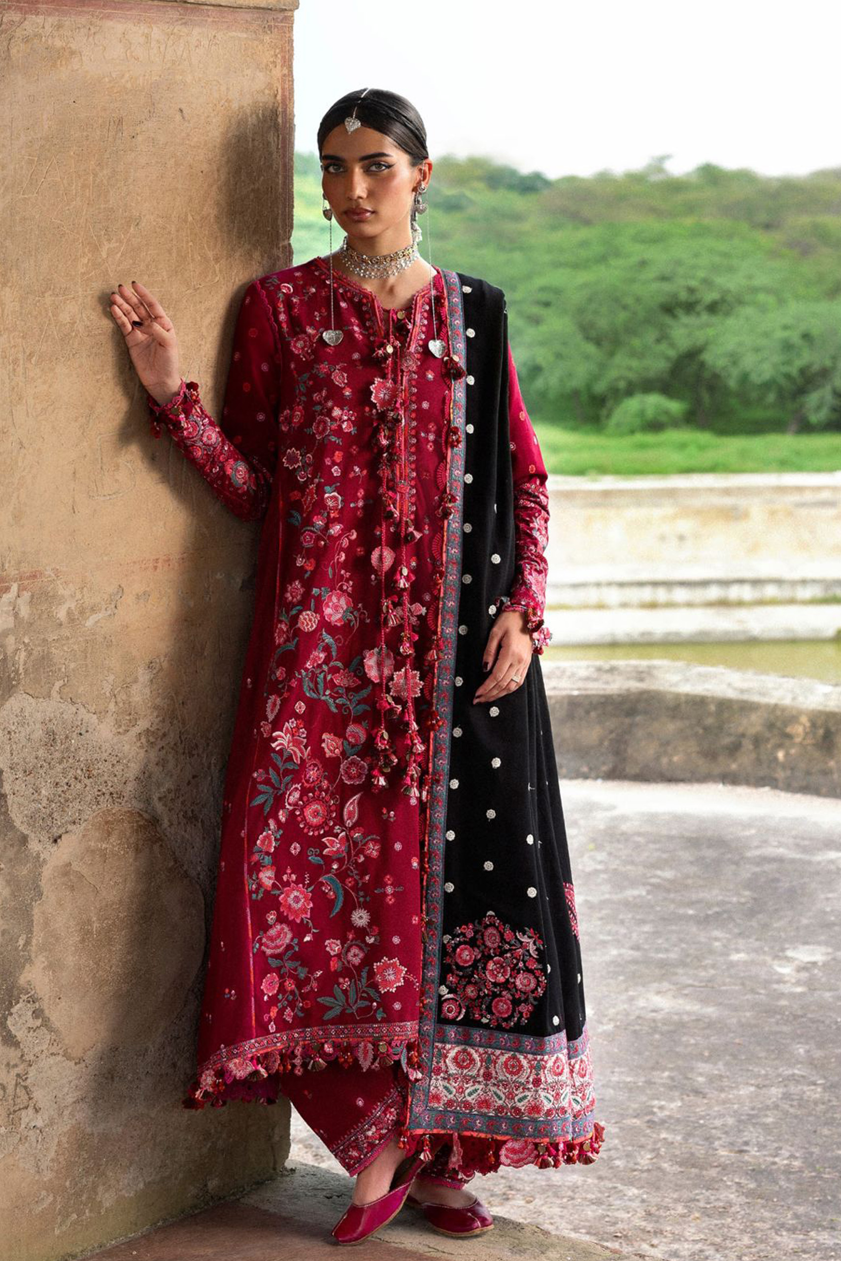 A vision of unparalleled elegance, this unstitched wine red ensemble offers a sophisticated elevation of the classic karandi silhouette. The shirt is beautifully embellished with delicate embroidery details. It is flawlessly complemented by a contrasting black embroidered karandi shawl, which features an eye-catching ivory border patch and is finished with a teal embroidery patti along all four sides. The outfit is completed with a matching wine red shalwar enhanced with tasteful embroidery accents, crafting an attire that exudes effortless grace.