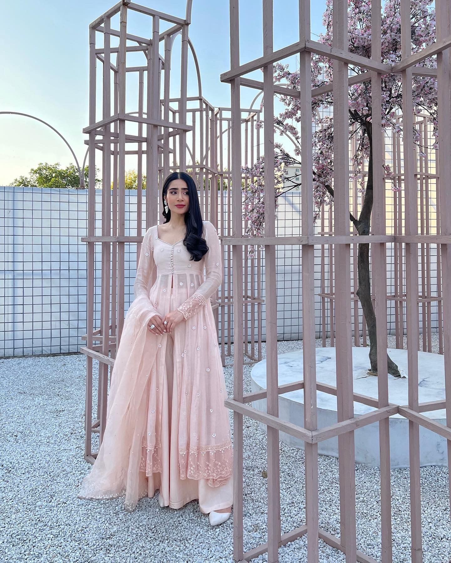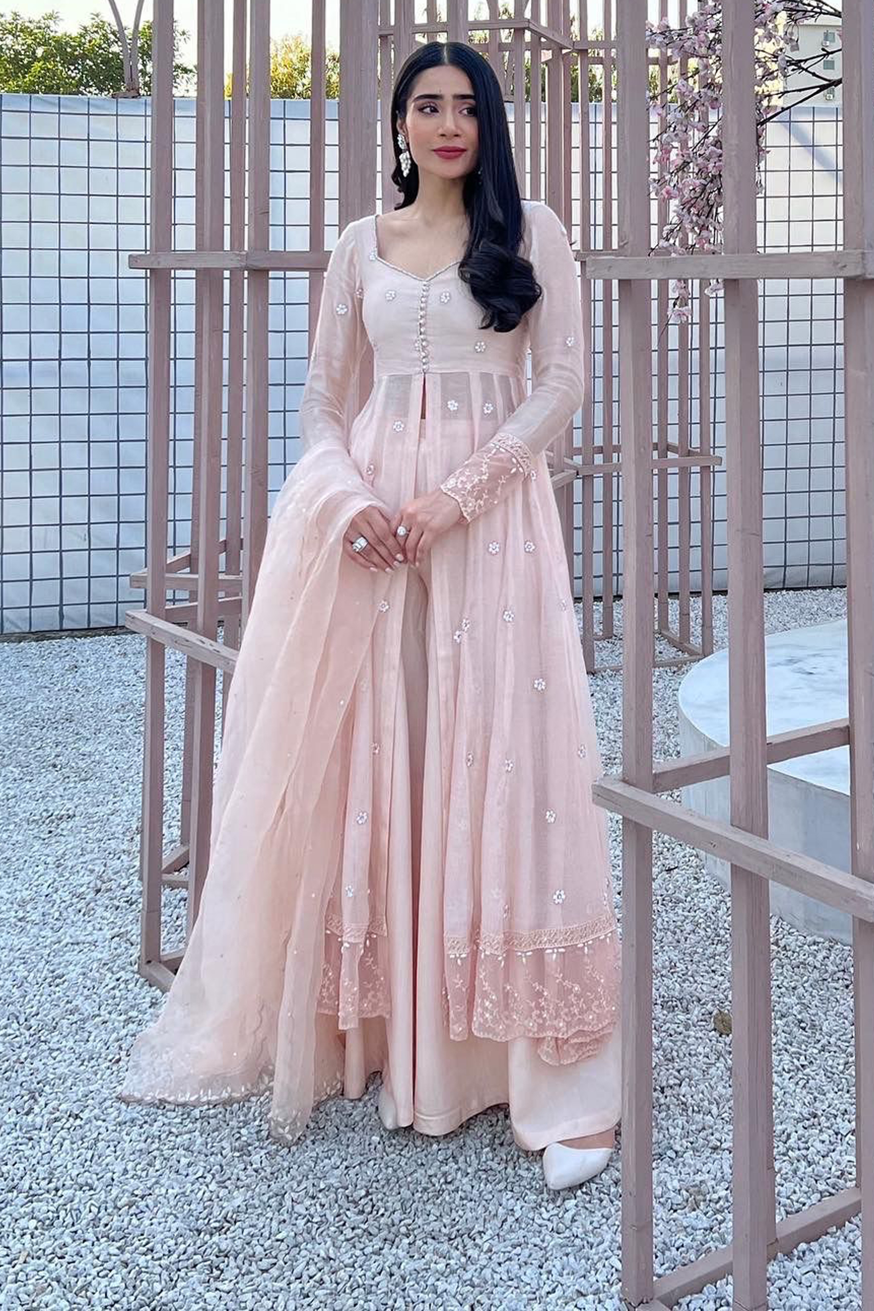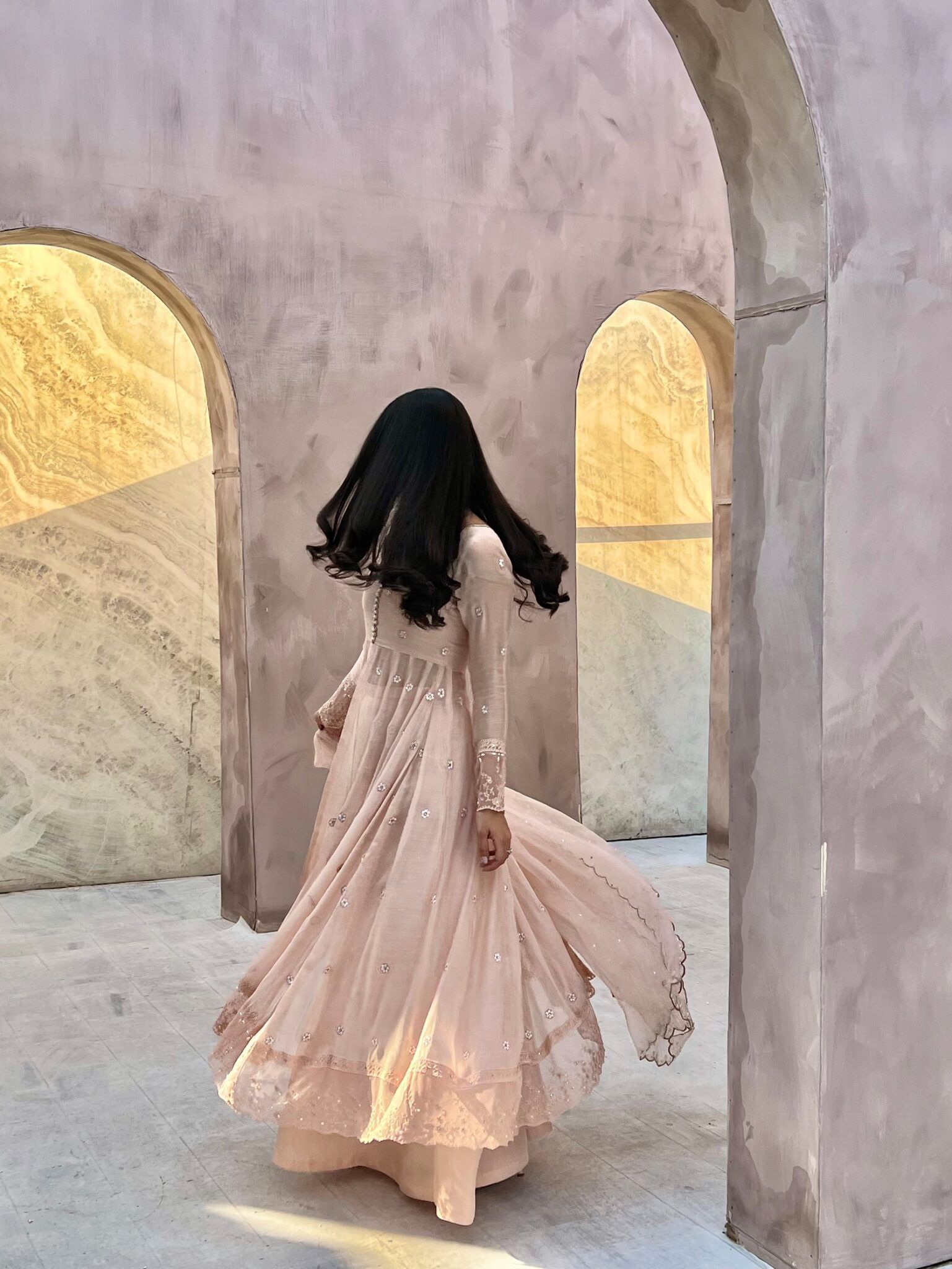 Straight out of a fairytale, this gorgeous three piece ensemble has flower but with Swarovski detailing all over it. Statement work of pearls on sleeves and daman is making it look festive and elegant. It is paired with sharara and pure organza dupatta. Dupatta is adorned with pearls and Swarovski work all over it.