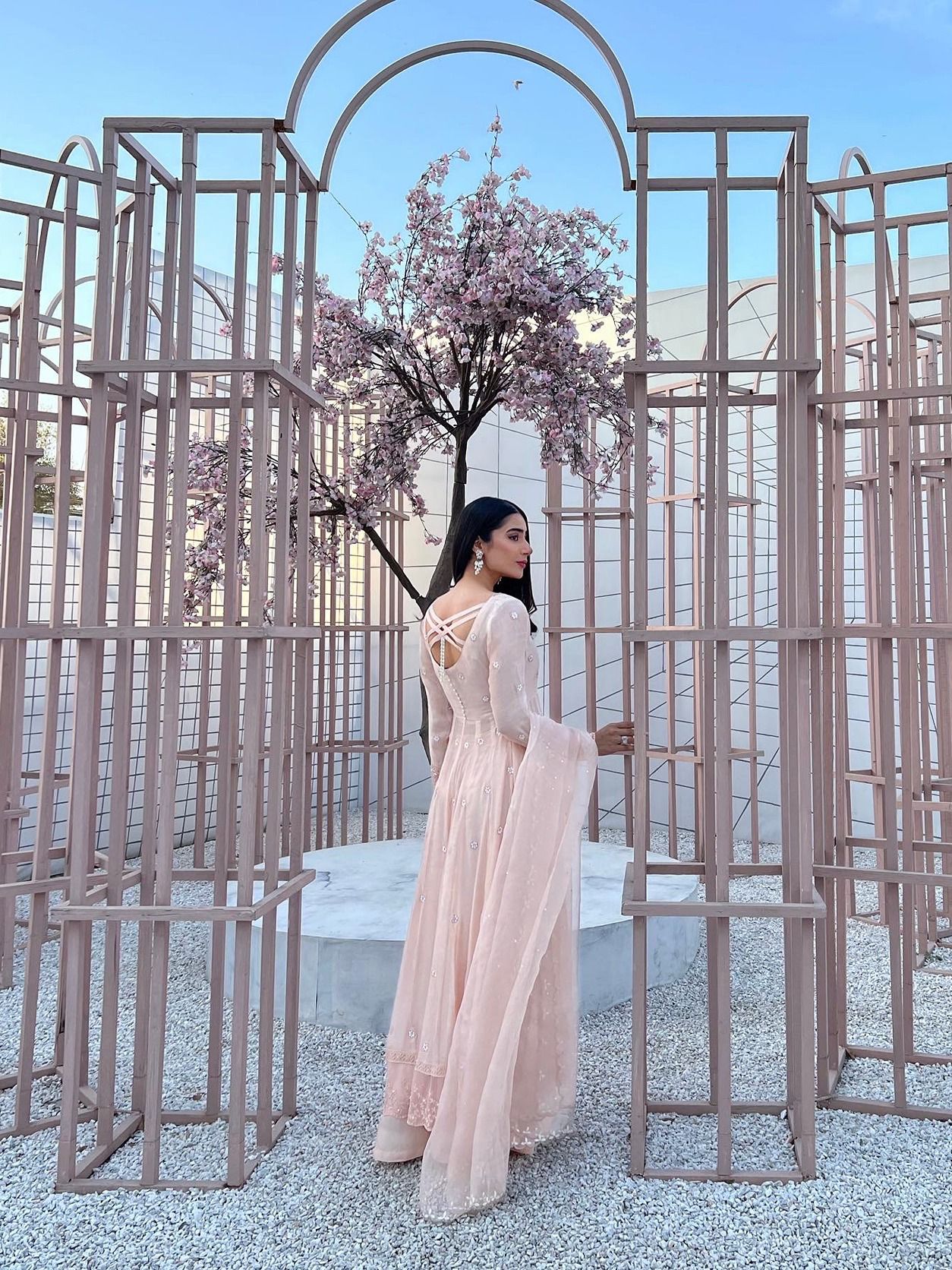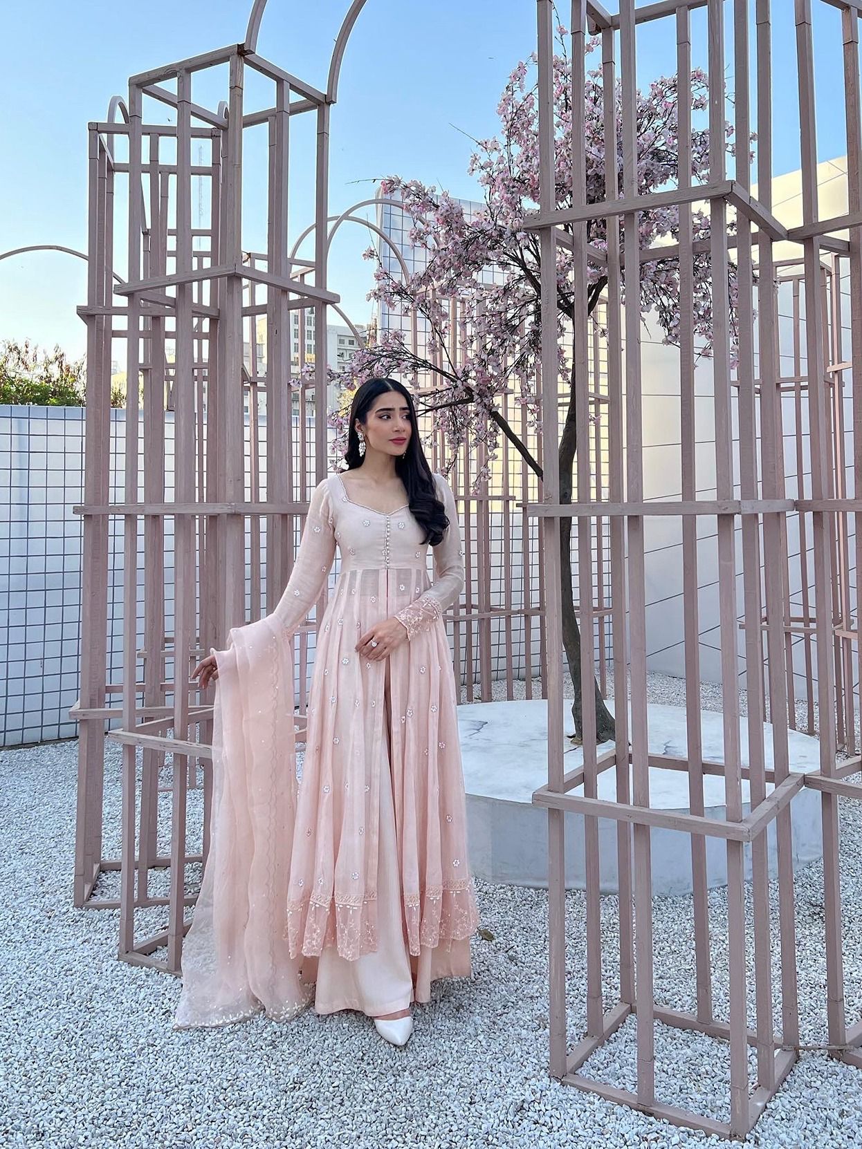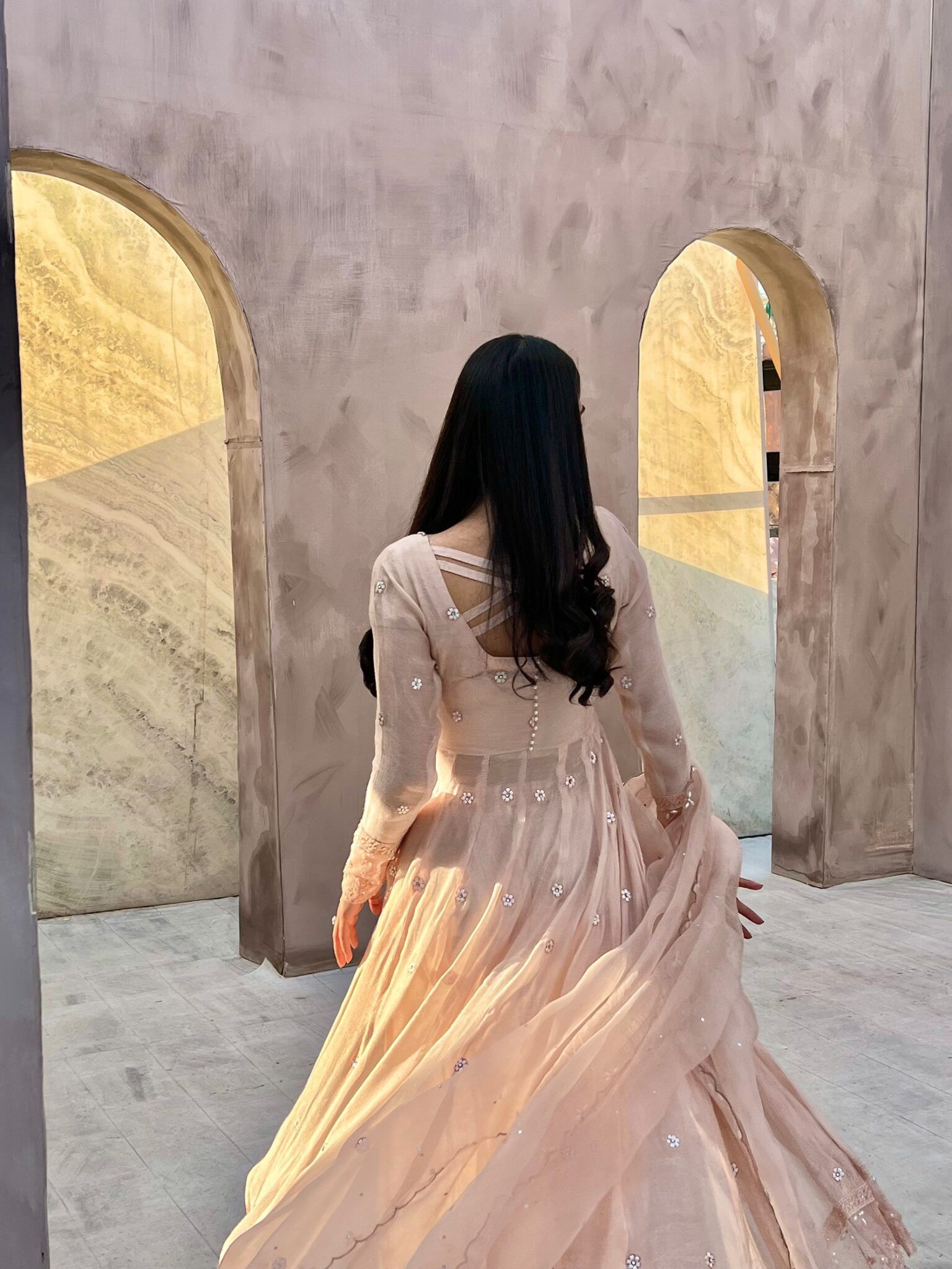 Straight out of a fairytale, this gorgeous three piece ensemble has flower but with Swarovski detailing all over it. Statement work of pearls on sleeves and daman is making it look festive and elegant. It is paired with sharara and pure organza dupatta. Dupatta is adorned with pearls and Swarovski work all over it.