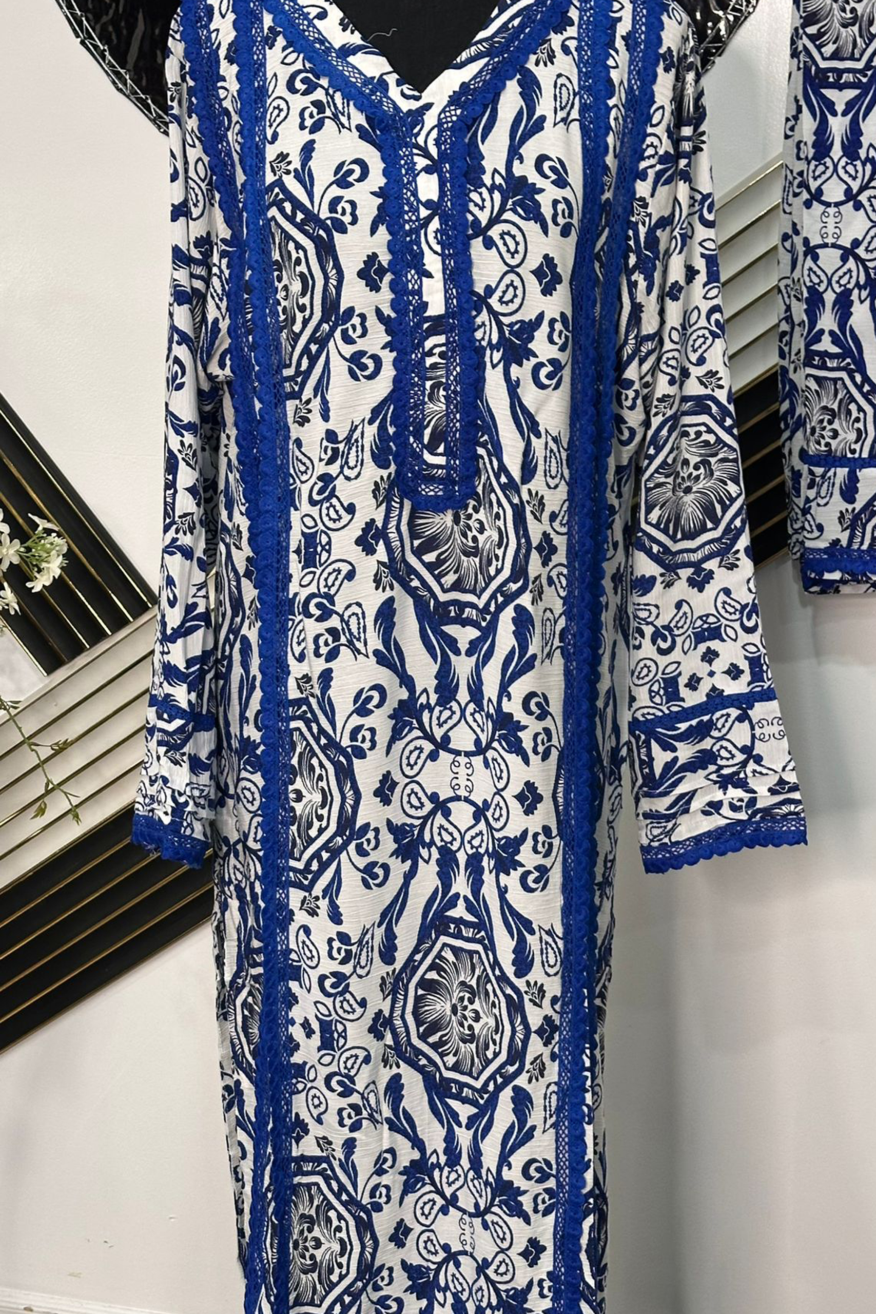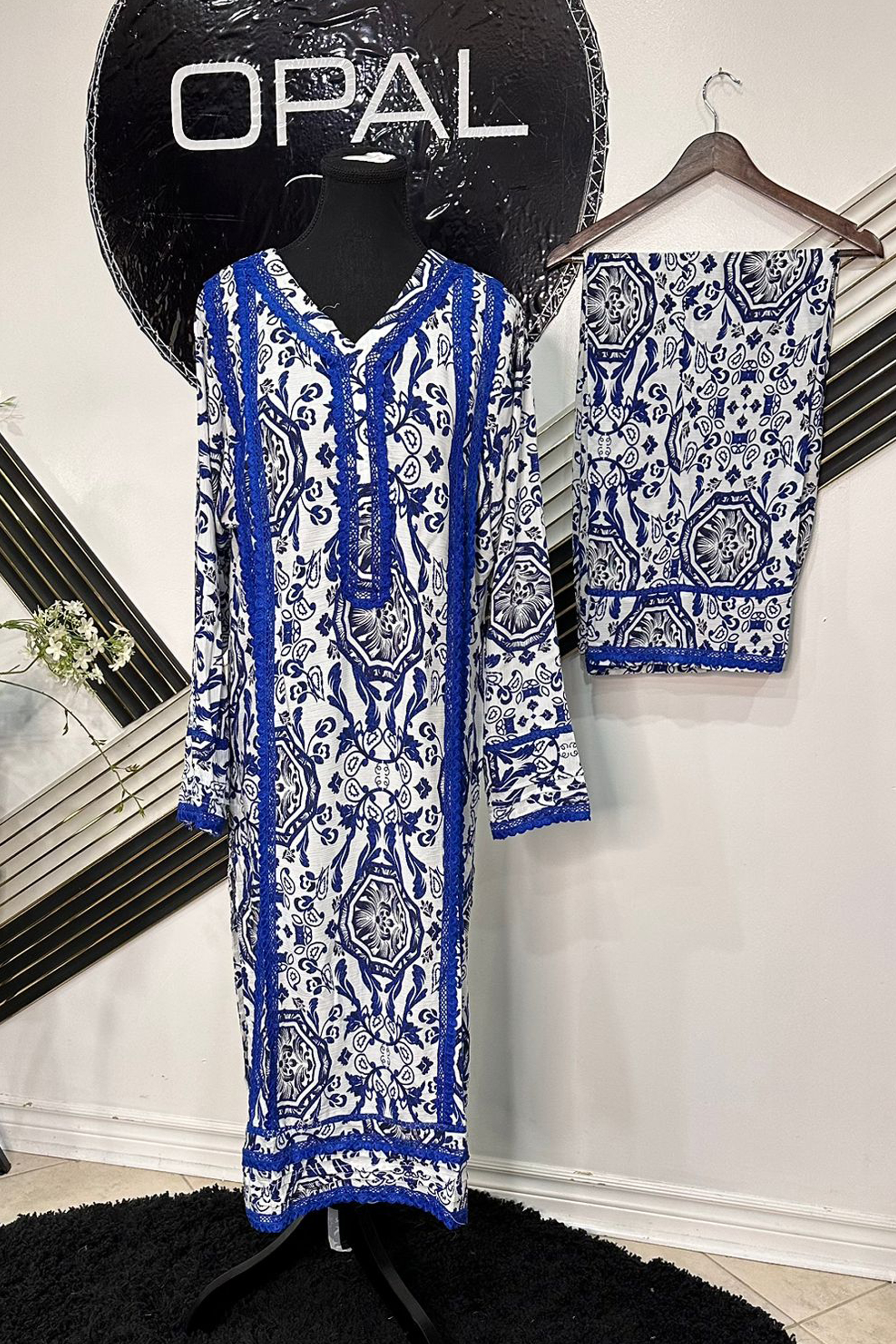 Paired with a beautifully coordinated printed trouser and a soft chiffon dupatta in a rich royal blue hue, finished with printed borders, this outfit offers the perfect balance of comfort and statement style.