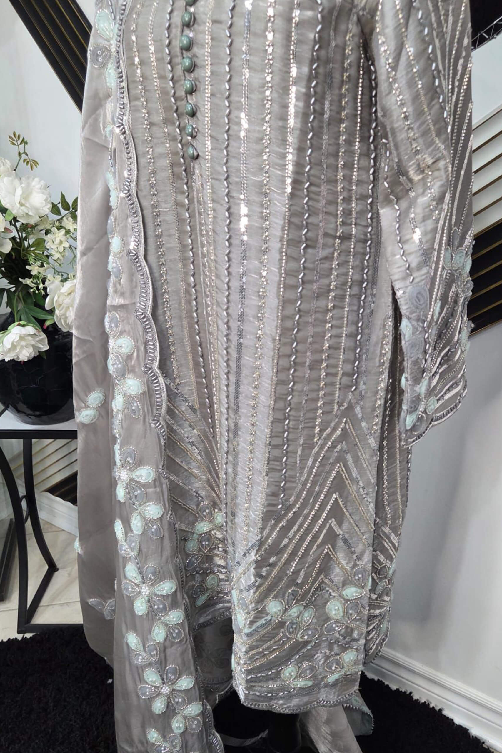 This beautifully crafted formal wear suit features intricate embroidery and embellishments on the shirt and dupatta, paired with a matching bottom. Designed with delicate detailing and premium fabric, it’s perfect for festive occasions and special gatherings.